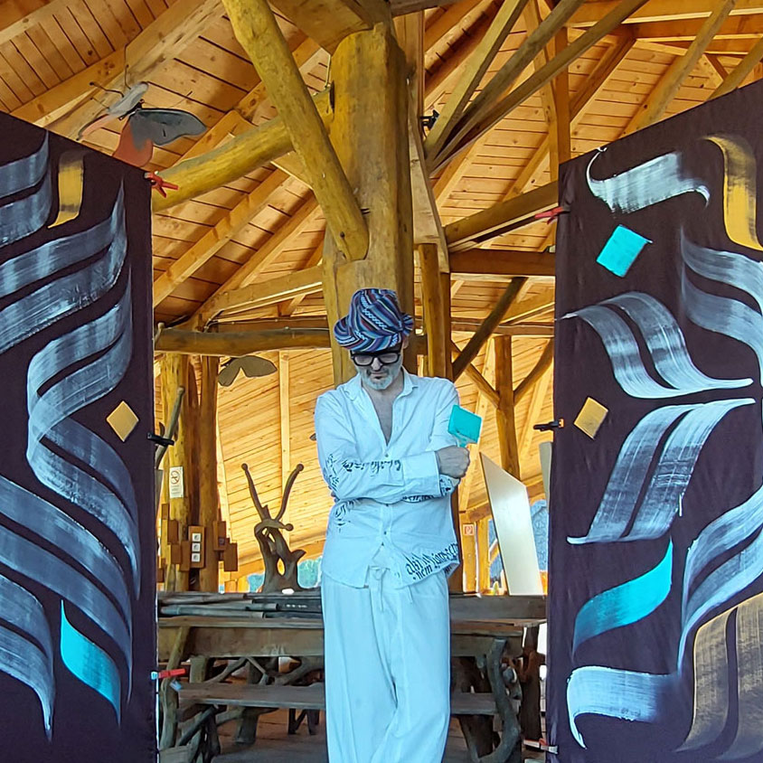 At age 18, he created his first calligraphic typeface. Calligraphy is a language he continually transforms and speaks through his art. His works, crafted using European calligraphy tools, evoke a sense of ancient timelessness. His art finds homes in diverse spaces, from festivals and urban streets to galleries, public spaces, and private collections.