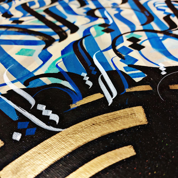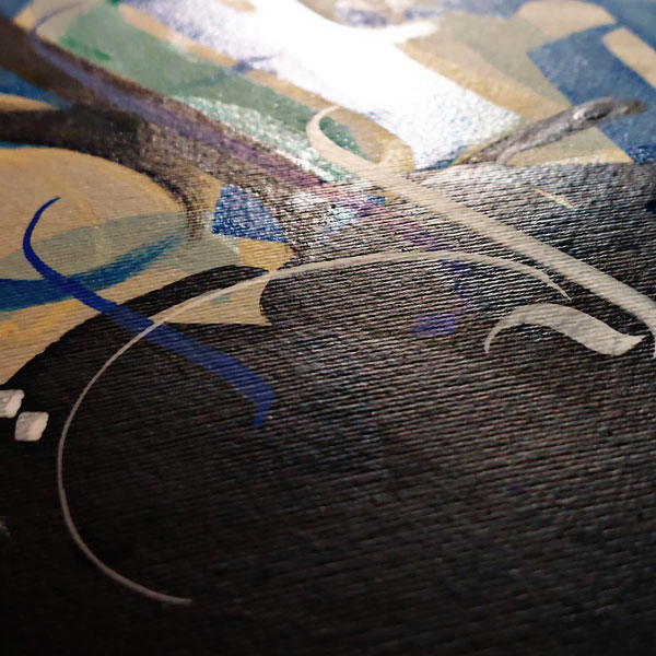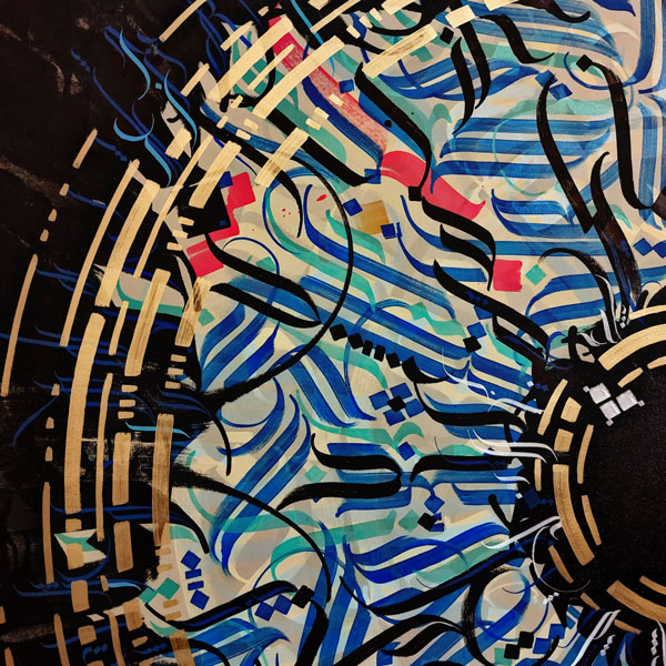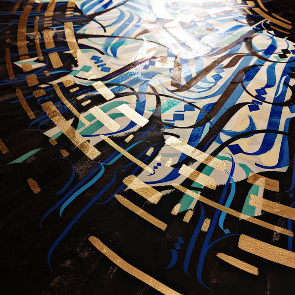 what we have here is an exquisite, dynamic interplay of modern abstraction and intricate design that immediately evokes the energy of contemporary calligraphy meeting the pulse of New York’s art scene. The piece is a bold exploration of form and movement, with vibrant blues and golds that seem to swirl and dance across the canvas, drawing the eye in and around. There’s an organic fluidity to the sweeping lines, reminiscent of the rhythm found in urban landscapes—think of the constant motion of the city, translated into color and shape.